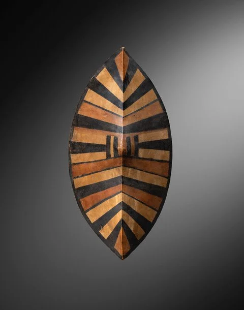 Soft wood, pointed at either end with the two halves meeting at an obtuseangle to form a ridge; a conical boss in the centre; ornamented with red and black chevrons; the handle is covered with rattan