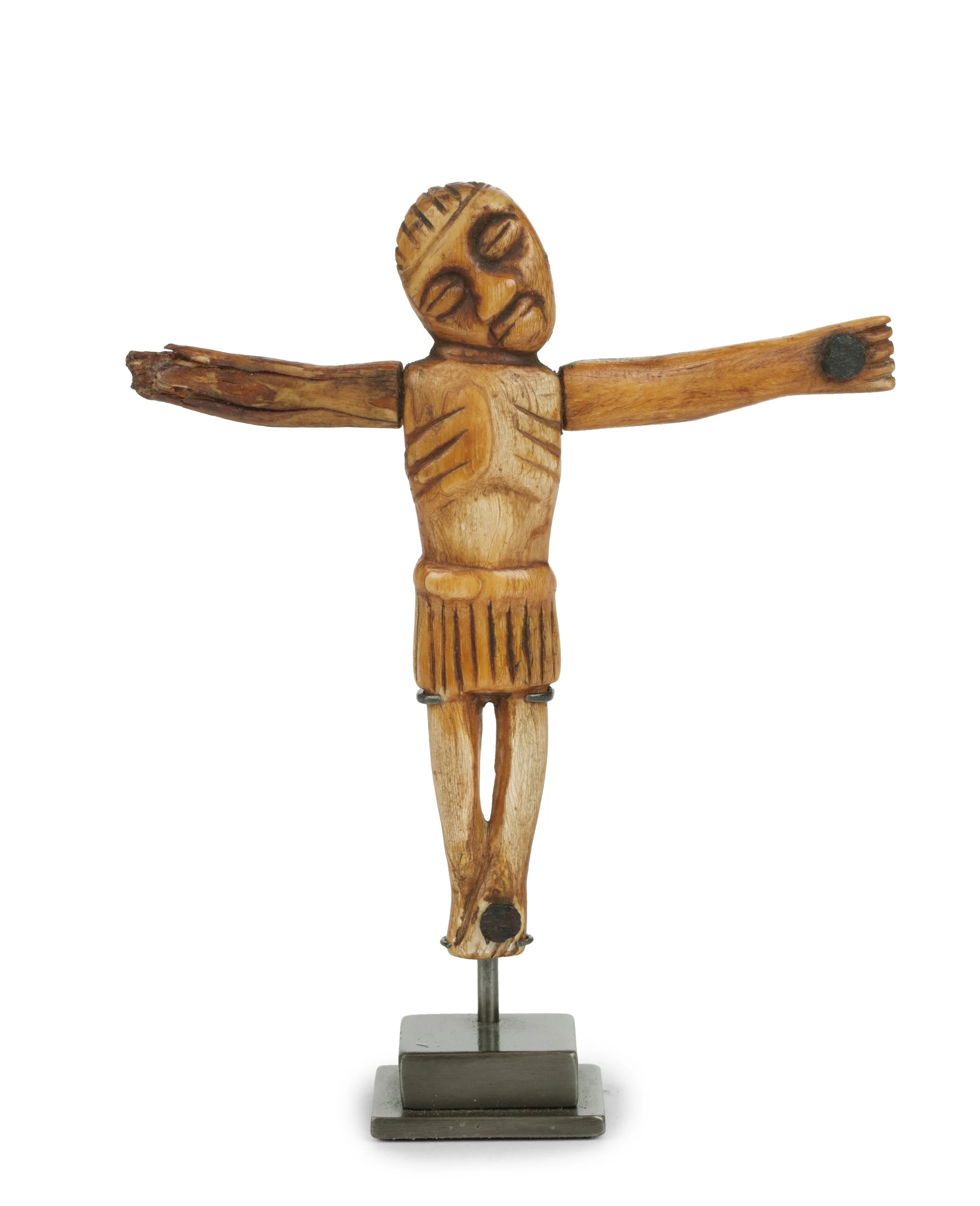 Ivory, the hand and feet are abstracted and two small wrought iron nails remain; one hand is missing.