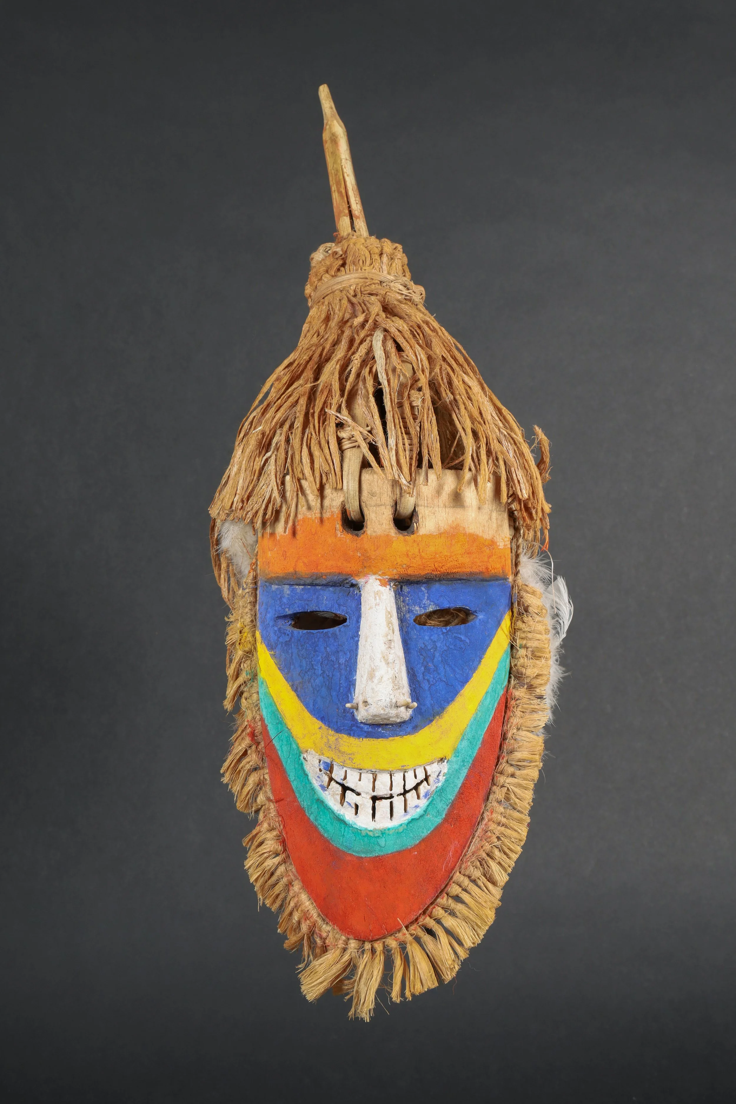 Carved wood, pigments, fibers, feathers, tooth