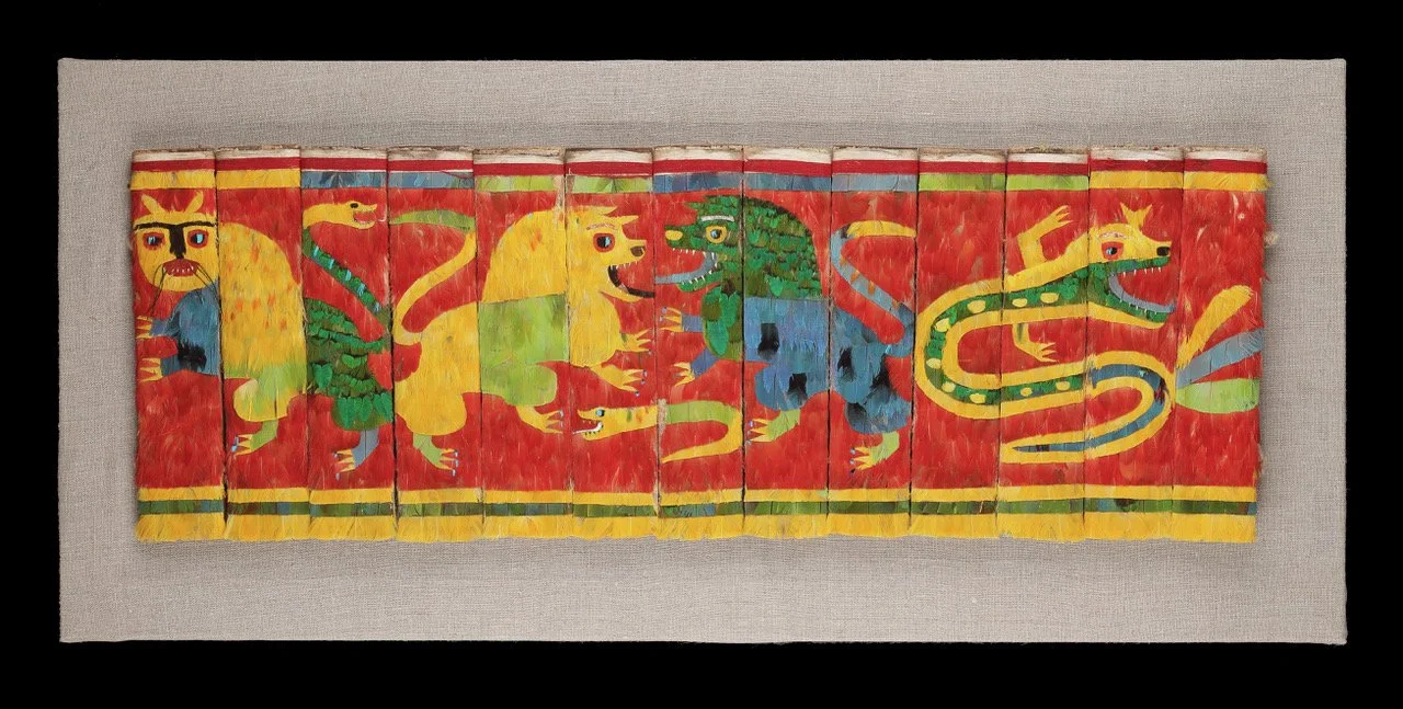 Tropical bird feathers, wood slat, cotton twine, glue