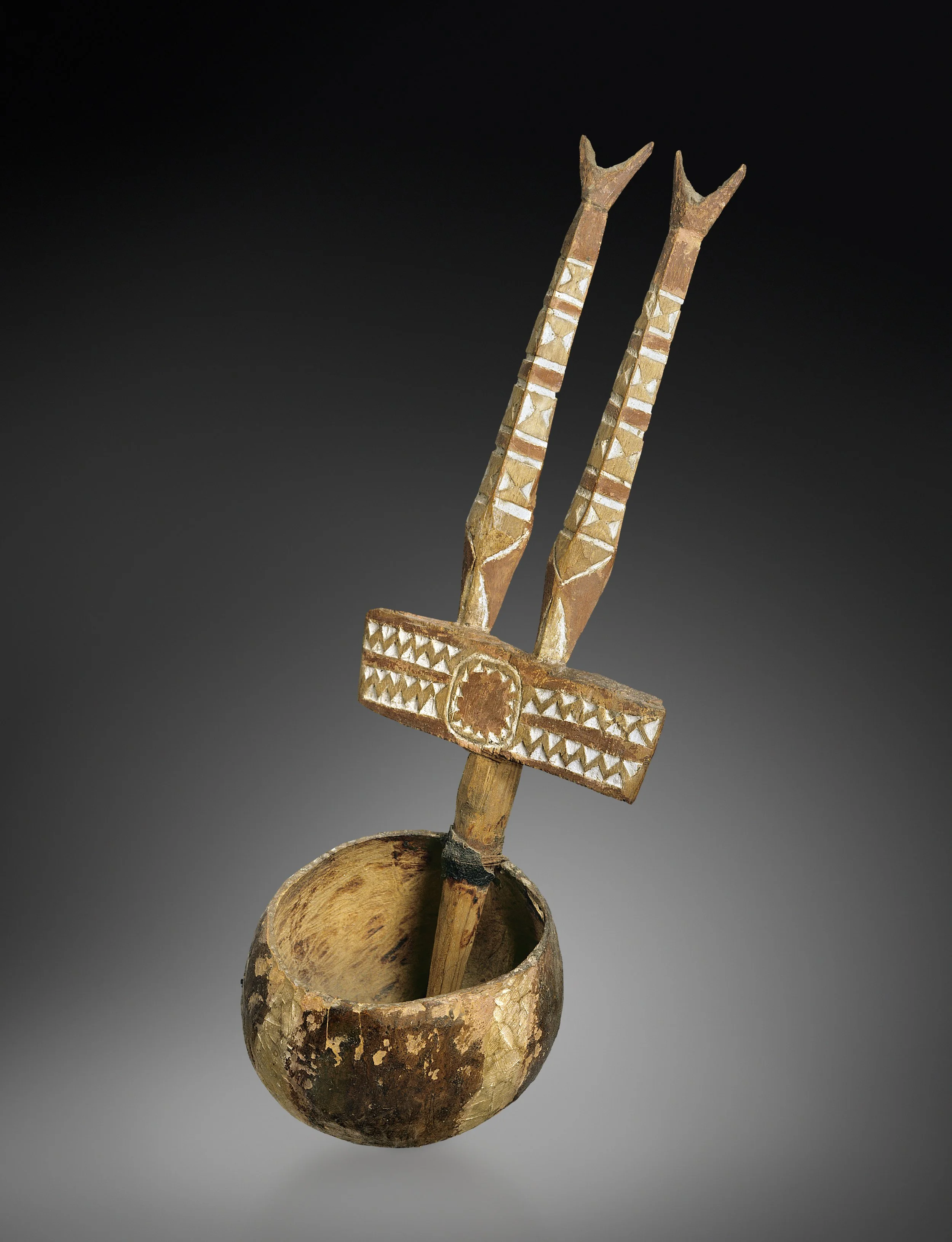 Coconut shell, wood (alstonia), pigments, and puttynut (Parinarium)