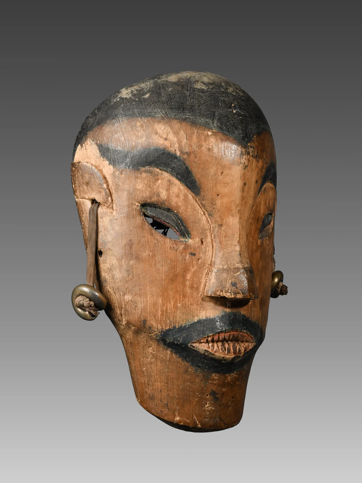 Wood with polychrome pigments and brass earrings